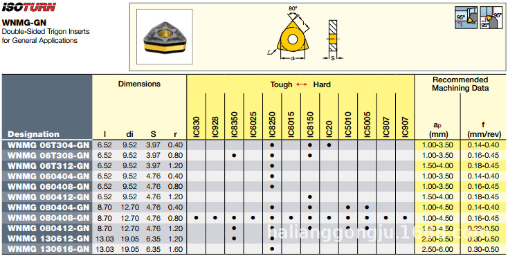 | IC50M | IC50M 非涂层P20-P30非涂层的硬质合金材质,用于钢件的伴有中_长切屑生成的粗、半精加工 | 非涂层 |